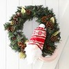 - The gnome is wearing a red and green ugly sweater printed knit beanie hat with a white pom pom top.