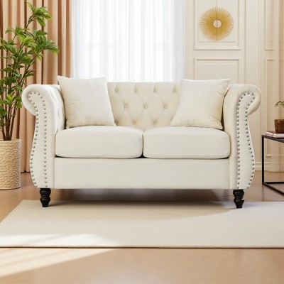 ORRD 58.8" Beige Velvet for Living Room, 2 Seater Sofa Tufted Couch with Rolled Arms and Nailhead for Living Room, two pillows