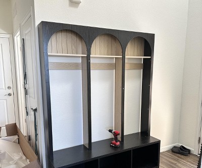 ORRD 59" Farmhouse Hall Tree with Arched Design, 8 Hooks & 3 Drawers, Entryway Bench & Shoe Organizer for Mudroom, Living Room(Black)