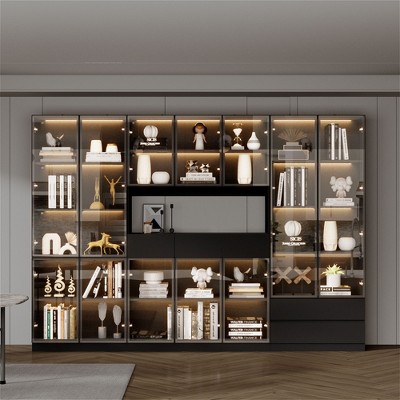 - The high gloss surface design of the cabinet doors adds a touch of technology and modernity to your home, while also being waterproof and easy to clean. The acrylic door and tempered glass shelves ensure that your collection is displayed in a clear and accessible manner.