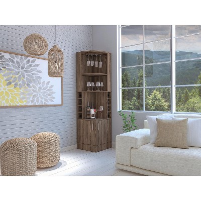 71" White Corner Bar Cabinet: Maximizes corner space with 5 shelves, 8 bottle cubbies, and stemware storage. Sleek white design blends into any decor—ideal for organizing drinks, glassware, and bar essentials at home.