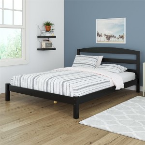 - Revel in the handsomely stained finish and beautiful low-profile simplicity of our full-size solid wood platform bed frame that is made from 100% pine and features a slightly curved open panel headboard and square block legs