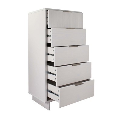 Create a serene bedroom retreat with this light gray tall chest. Its soft hue blends modern glam design with solid wood strength, featuring five full-extension drawers (top drawer includes organizer) and chic gold handles. The narrow footprint saves space while offering stylish, ample storage for any contemporary or Scandinavian-inspired room.