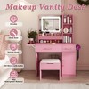 Upgrade your beauty routine with this Pink Vanity Dressing Table. Featuring bright LED mirror lights and a convenient power outlet charging station, it keeps your devices charged while you get ready. With 3 spacious drawers, 7 shelves, and a comfortable storage stool, it offers ample space for makeup, skincare, and accessories. Perfect for girls and women, this stylish vanity adds a touch of elegance to any bedroom while keeping everything organized and within reach.
