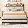 Upgrade your bedroom! This queen platform bed features a built-in charging station (2 outlets + 2 USB ports), storage headboard, and soft footboard. Sturdy metal slats support mattresses without box springs. With 10.2" under-bed storage and 1100lb capacity. Perfect industrial retro style in elegant beige linen.