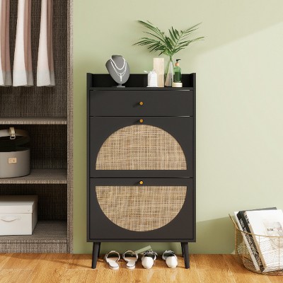 Upgrade your entryway with this stylish rattan shoe cabinet. Featuring 2 doors, 1 drawer, and double-layer storage with a built-in divider for optimal organization. The handcrafted rattan and open back design ensure ventilation. With a 45lb capacity and a handy top ledge, it's the perfect blend of natural art and practical function.