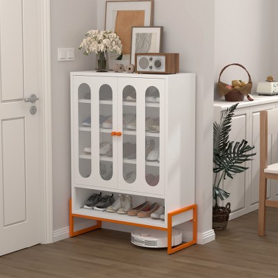 Designed for narrow areas, this sleek and slender shoe storage cabinet fits perfectly in tight spaces. The lower open shelf provides additional room for sandals and flats, ensuring all your footwear is well-organized and easily accessible.
