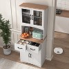 Organize your kitchen with this elegant white pantry cabinet. Featuring framed glass doors, a handy drawer, and adjustable shelves for versatile storage. The built-in cable management hole and anti-topple device ensure safety and convenience, making it perfect for storing dishes, appliances, and more.