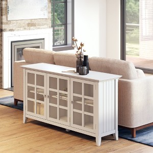 Transform your space with this elegant wide storage cabinet! Features 3 tempered glass doors, 3 adjustable shelves, and handcrafted solid wood construction. Beautiful white finish with protective lacquer. Transitional design with tapered legs and brushed nickel knobs. 62"W x 34"H perfect for living rooms, dining areas, and offices. Combines style and functionality!