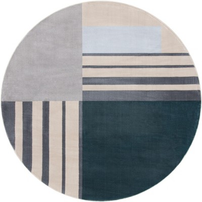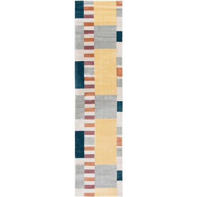 A: The rug features an Art Deco design with block geometrics and colorful mosaics.
