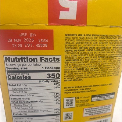 vanilla creme sandwich cookies (enriched wheat flour [wheat flour, niacin, reduced iron, thiamine mononitrate, riboflavin, folic acid], powdered sugar [sugar, corn starch], shortening [palm oil, canola oil, modified palm oil], sugar, corn syrup, corn starch, sodium bicarbonate, salt, natural vanilla flavor, soy lecithin, ammonium bicarbonate), cooked ham - water added chopped and formed - smoke flavor added (ham, water, contains less than 2% of sodium lactate, salt, modified cornstarch, potassium salts, sodium phosphates, sugar, sodium diacetate, sodium ascorbate, sodium nitrite, flavor, smoke flavor); cheddar pasteurized prepared cheese product (milk, water, milkfat, milk protein concentrate, whey, whey protein concentrate, sodium citrate, salt, lactic acid, sorbic acid as a preservative, cheese culture, oleoresin paprika [color], enzymes, annatto [color], with sunflower lecithin added for slice separation), crackers (enriched wheat flour [flour, niacin, reduced iron, thiamine mononitrate, riboflavin, folic acid], palm oil, sugar, vegetable oil [canola, and/or soybean, and/or palm oil], contains 2% or less of salt, leavening [baking soda, ammonium bicarbonate, monocalcium phosphate], soy lecithin, natural flavors).