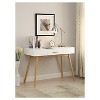 This desk is really cute. I’d say it’s a little high. It doesn’t seem really sturdy because of the legs but I like it. Minimalist looking design. My only issue with the desk is it came with a paint peel/crack on the surface. It was too inconvenient for me to return it.