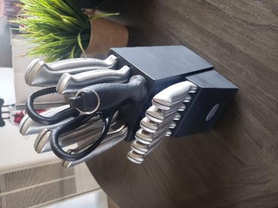 Complete your kitchen with this Baldwyn 14 piece Stainless Steel Cutlery Block Set in silver and Black. Each blade of the knives are precision-stamped for durability through the full length of the knife. This Oster knife set also features high-quality, stain- and rust-resistant stainless steel blades to last you throughout the years.