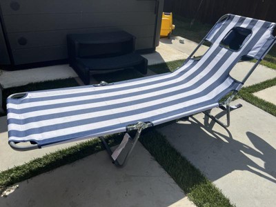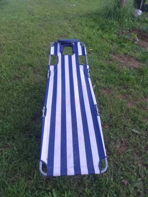 [This review was collected as part of a promotion.] This has been a great outdoor folding lounge chair! It is lightweight and I love that it folds into a backpack which makes it easy to take to the beach, lake etc! You can adjust it to 4 different positions. One feature I love is that it has a open/close face cavity with arm slots for you to lay completely face down! Perfect for tanning your backside!