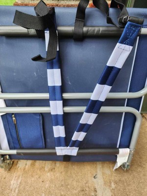 [This review was collected as part of a promotion.] This is a fantastic lay-out chair, with a pillow for laying face up, and a face-rest under the pillow for laying face-down. It folds out easily, but remains sturdy and taught, and the material is thick and good quality. There are several folding positions for reclining. The only downside that was a little annoying, is that when you unsnap the carrying straps to unfold it, there’s nowhere to store the straps. They just kind of flop and lay on the ground. I imagine they would get pretty dirty after lots of use. I just wish there was another snap on the back or something to fold them back up. Other than that, definitely a fancy chair to spend my days in the sun with!