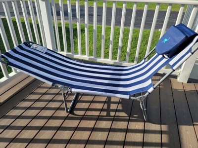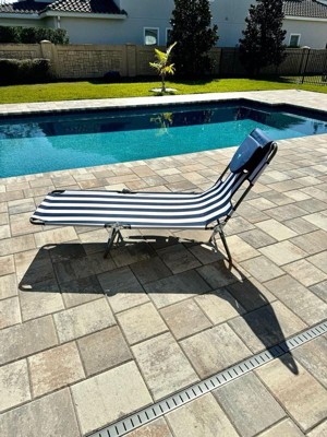 [This review was collected as part of a promotion.] This Chaise Lounge Folding Portable Sunbathing Beach Chair with Navy stripes is very portable but it's not very secure. It's a bit difficult to secure it in place.