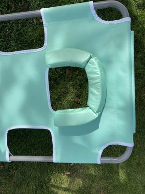 Featuring an open-and-close face cavity with armholes for breathability, you'll be able to achieve a comfortable position for a relaxing day of sun. Customize your comfort with 4-position options to recline or lay flat. Simply fold down and pick up the carrying straps you're ready to go, allowing you to have your hand free to tote your other necessities. These tanning loungers are constructed of powdered steel, support up to 250 pounds, and show off a soft teal color fabric made of durable polyester.