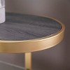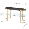 Strike gold with this contemporary console table. The spacious tabletop provides ample space for family photos and a table lamp, while the clear glass shelf holds potted plants and decor. A gold metal frame curves around the ebony tabletop, crafting a sleek look. Add a focal point to your decor with this elegant console in your entryway or open concept living space.