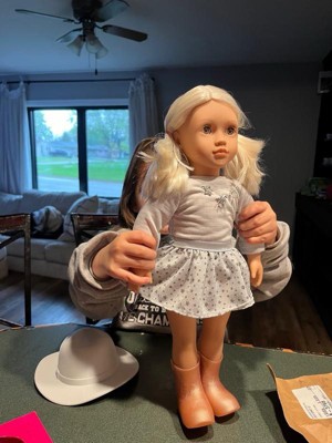 [This review was collected as part of a promotion.] This doll is absolutely adorable. My daughter loves the horse charm on her shirt and her hat. She is a pretty big size. It is the perfect size for my three year old to play with.