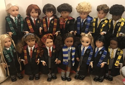With a brush out, quick hair wash and dry. Used some odor free hair cell to slick back the hair, the a very easy straight cut in back in the collar turned this adorable girl doll into the Harry Potter Slythern Draco character with of course a Harry Potter Slythern uniform. Dyed some of the left over light blue pants dark grey to complete the look. Perfect in my book. (See pic, Top LH Doll). Just used the great little grey cowgirl outfit else where.
