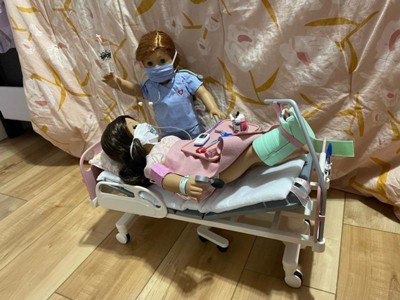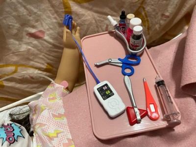 - Includes: bed, hospital gown and bracelet, face mask, stethoscope, syringe, thermometer, leg cast, and realistic medical accessories