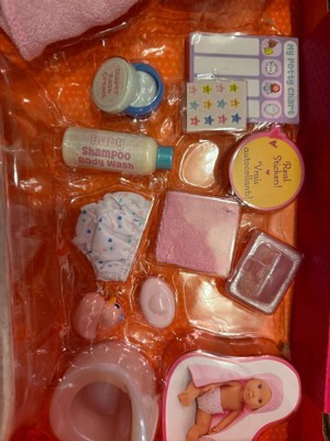 - Includes: 8-inch baby doll, bathtub with 2 water sounds, potty, bath ducky, 2 toy bubbles, bar of soap, baby wipe container, shampoo bottle, jar of diaper rash cream with lid, 2 diapers, a hooded towel, a washcloth, a potty chart, stickers, and 3 x AAA batteries.
