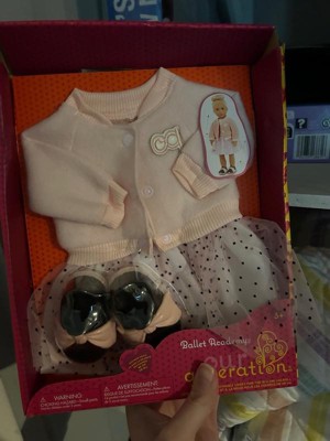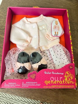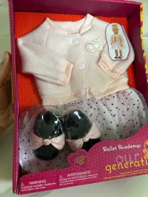 Sporty, stylish, and fun all in one! The Our Generation Ballet Academy outfit lets kids explore fresh looks as they dress their favorite 18-inch doll. The button-front varsity jacket with an OG patch will quickly become a fashion favorite in your doll's wardrobe. Plus, it includes a confetti-print ballet dress and shoes with pink bow accents for extra sweet style. Mix and match each piece with other Our Generation doll clothes for more cute combos and set fun trends. Our Generation 18-inch doll clothes make a great gift for kids ages 3 years old and up (small parts), encouraging imagination and self-expression as they create their own unique stories. Compatible with most 18-inch dolls, doll clothes, and accessories. Our Generation dolls sold separately.
