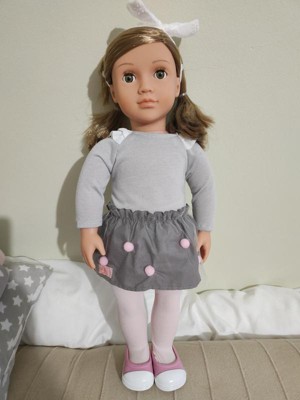 - Includes doll, skirt, top, tights, underwear, headband, and casual shoes