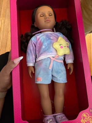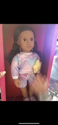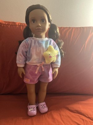 Dream big and create endless sleepover fun with Our Generation 18-inch doll Carmen! What makes the ultimate slumber party? Best friends, lots of laughter, and fantabulous PJs, of course! Her cosmic tie-dye pajamas are beaming with vibrant pink, blue, and purple hues. Plus, themed accessories like shoe charms add extra styling flair, while a star plush pillow makes every sleepover wish come true. This 18-inch doll has a huggable soft body and lifelike details to delight doll fans during playtime. Her wavy auburn hair is fun to brush and style, and her dark-brown eyes really close as kids explore sweet dreams together. An easy-change outfit inspires mixing and matching as fashion lovers dream up even more fun looks on any adventure. Our Generation dolls make a great gift for kids ages 3+ (small parts), encouraging them to imagine their own unique stories.