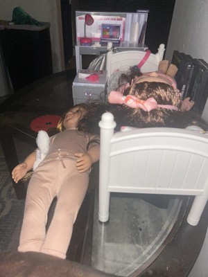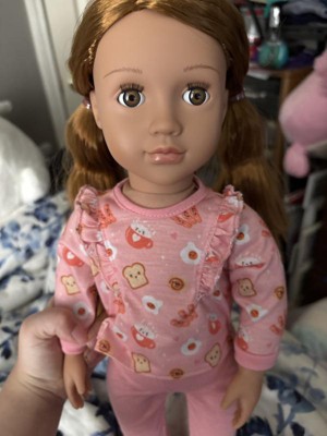 - Includes: doll, a food-print pajama top, pajama bottoms, a pair of undies, slippers, 6-inch Dachshund dog plush, removable collar and hair bow, attachable leash, pillow, chocolate milk, fork, food bowl, plate, eggs, bacon, and toy bone.