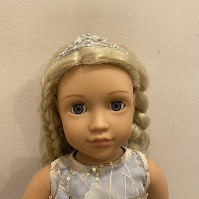 Celebrate special events with Ellory! This Our Generation 18-inch doll has beautiful blue eyes that open and close, and her long, brushable blonde hair is fun to style. Give Ellory pretty ponytails, braids, updos, and more fun looks before accessorizing with her tiara. Then help her shine extra bright with the beaded bracelet and super cute earrings – she has pierced ears! Ellory has a cuddly soft body and can rotate her neck, arms, and legs to easily change outfits. She arrives wearing a lovely floral gown outfit decorated with golden sequins and a pair of sparkly shoes. Ellory’s gown also features easy-open closures to quickly put on and remove, so you can dress her in more fun Our Generation styles for any adventure!