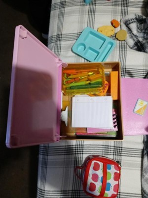 - Includes: Doll, school desk with opening front, stickers, lunch bag, cafeteria tray, play food items, and school supplies.