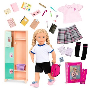 - Includes: Doll, 2 outfits, pink shoes, school locker, 3 locks, backpack, 2 worksheets, 2 folders, sticker sheet, 2 copybooks, pretend calculator, certificate, ruler, pencil case, storage bin, clipboard, 9 writing supplies, storybook, and bookmark.