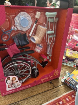 - 18-inch Doll Wheelchair Set: care for your 18-inch dolls and help them roll toward recovery with the Our Generation Heals on Wheels set!