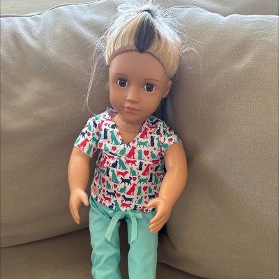 Give comfort and care to pets everywhere with the Our Generation - Healthy Paws veterinarian outfit for 18-inch dolls! With the right tools and a lot of love, your dolls will be able to make their furry friends all better. Dress your doll in the veterinarian uniform (called "scrubs"), a short-sleeved shirt with colorful animal print and a pair of green pants with a waist tie. Vets need to be on their feet a lot during a day at the clinic; help your doll stay comfortable in the practical vet shoes. When it's time to give your pet pals a check-up, use the stethoscope to listen to their heartbeat and the otoscope to check their ears - it really lights up! The veterinarian's notepad and pen let you record any symptoms and treatment your doll will prescribe. This outfit pairs perfectly with Our Generation's range of Loyal Pals as well as the OG Healthy Paws Vet Clinic. The doll in the pictures is Naya. (Dolls, pets, and vet clinic sold separately, available at Target. Compatible with American Girl dolls.)