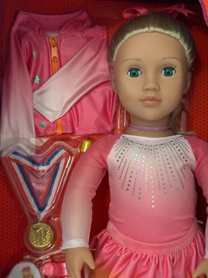 - Includes: Posable 18-inch doll, gymnastics outfit and jacket, hair bow, medal, rhythmic gymnastics stick, ribbon, and hula hoop.
