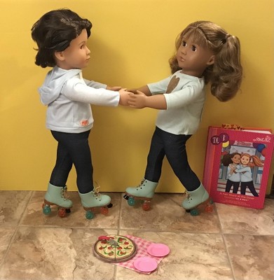 - Includes 2 complete outfits, roller skates, a pizza, and storybook; 17 items total.