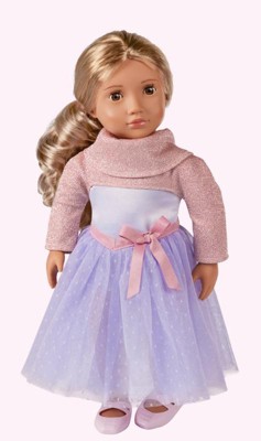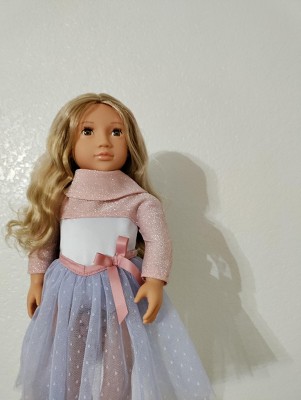 This Our Generation girl doll is very cute with wavy blonde hair, brown eyes, light pink colored lips and light skin tone. I bought mine for $20 and she was worth the wait. personally I am not a fan of the very small sweater that doesn't function as such and when you lift the arms a little it stretches out the top sweater piece, coming off very easily. Other than that this doll is the right choice for doll loves and especially if they live dancing.