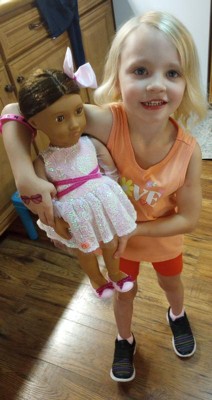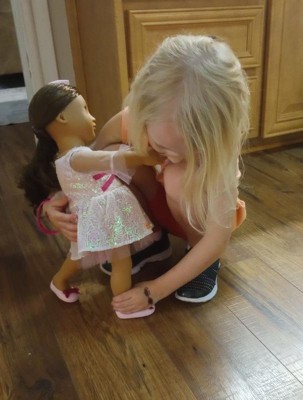 Shine bright on every playful adventure with Our Generation 18-inch doll Katia! She wears a shimmery dress that gives fashion lovers an extra pop of dress-up pizzazz. Plus, her oversized hair bow lets them add playful charm to every hairstyle, giving a boost to creative expression. Katia has a huggable soft body and lifelike features that will delight doll fans during playtime. Her beautiful hazel eyes open and close, and her wavy brown hair is fun to style in many ways. Her outfit has easy-open closures to quickly put on and remove, so kids can mix, match, and dream up even more cute looks! Our Generation dolls make a great gift for kids ages 3+ (small parts), encouraging them to create their own unique stories.