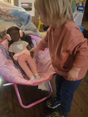 - Includes: 18-inch doll, a flip-sequin top, pink pants, a pair of undies, running shoes, a luggage and headphones with cute cat ears, a passport, boarding pass, pretend video game console, travel drink, and a pack of gum.