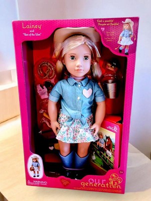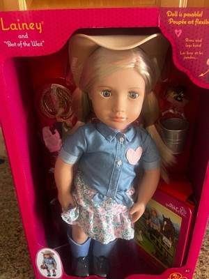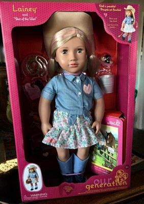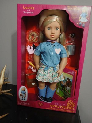 [This review was collected as part of a promotion.] I am reviewing Our Generation Lainey Best of the West Doll in exchange for my honest review. This doll is a large doll, 18 inches and she has amazing details. She comes with eyes that open and close and movable arms and legs. I love that she is dressed as a cowgirl and has a cute dress and hat. She also has many accessories( brushes, rope, pail) and even comes with a book about her. This doll is perfect for my horse loving 5 year old as a first doll. One could have so many adventures with her. I highly recommend this beautiful, well made doll for any child.