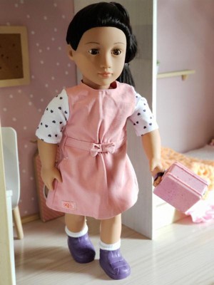 Explore friendship and school-day fun with Lin! This Our Generation 18-inch doll has a huggable soft body and lifelike features to delight doll fans during pretend play. Her beautiful brown eyes open and close, and her long brown hair can be styled in lots of ways! Lin arrives wearing a cute dress with a heart-print top, socks, and bright purple booties. She also has a pretty pink lunch box to carry her favorite treats to school! When it's time for dress-up, Lin's outfit has easy-open closures to quickly put on and remove. So you can mix, match, and create more stylish looks for every adventure!