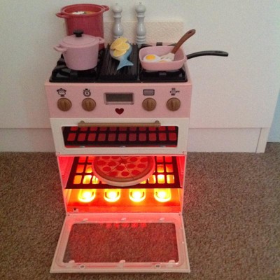 This oven is fantastic and has so many great features. It has 4 hobs and when you turn the knobs they make different sounds (3 in total) that are very realistic, a pot boiling, a frying sound and a timer that ticks, counts down then rings. It has 2 ovens, a top oven and a larger bottom oven both complete with a rack each and also a grill plate between the hobs. The best feature though has to be the bright red light that comes on in the bottom oven when opening the door, as though it's cooking, it's just great. The accessories that came with it are very good and detailed like the soup pot, pizza, whole chicken and the fish but I would have liked more. It would be great if they brought out additional food sets for this oven maybe like pots of vegetables or a tray of chips in individual portions so after cooking they could be served up as I think that would totally enhance play more with lots more options to cook. An excellent item though and it's so much fun.
