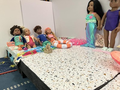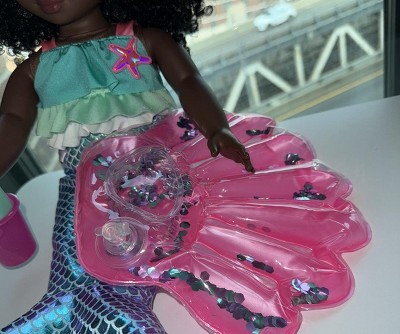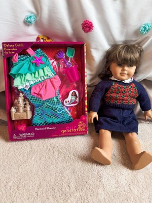Dive into magical adventures with the Our Generation Mermaid Dreams set for 18-inch dolls! Turn your favorite doll bestie into a mermaid with the ruffle swim top and shimmery mermaid tail. Then, use the starfish hair deco to complete their marvelous look. It sticks to their doll's hair for easy styling! A glittery seashell pool float that really inflates adds to the storytelling. And themed accessories like a detailed sandcastle with beach toys let kids take the fun ashore. This Our Generation doll clothing set is filled with oceans of playtime possibilities. Compatible with most 18-inch dolls and accessories. Makes a great gift for kids ages 3+ (small parts), encouraging them to create their own unique stories. Our Generation dolls sold separately.