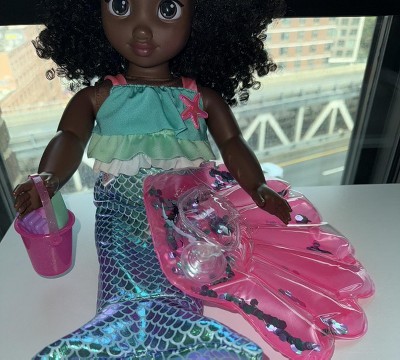 [This review was collected as part of a promotion.] While my daughter enjoys the outfit for the doll, it doesn’t fit very well. Additionally the shell float it came with has tiny holes in it so can’t be used. It’s cute but not able to be used as intended.