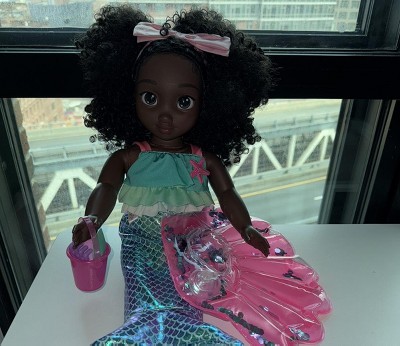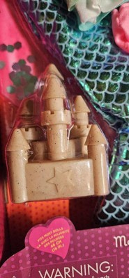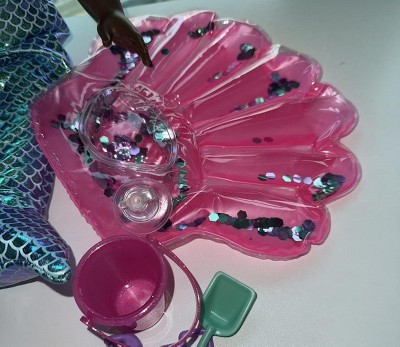 - Includes: Shimmery mermaid tail, a ruffle swimsuit top, cute swimsuit bottoms, inflatable seashell pool float, starfish hair deco that easily sticks to doll's hair, detailed sandcastle, shovel and rake beach toys, and a glittery bucket.