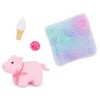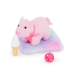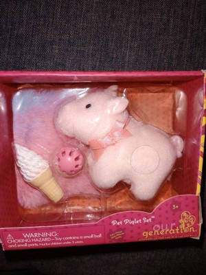 Get ready for piggy playtime! This Our Generation pet set is perfect for 18-inch dolls and kids who love animals. Tiny but mighty, the pink plush piglet is super soft and measures about 2.5" (H) x 3.5" (W) for dolls to hold in their hands! Use the multicolored faux-fur pillow as a bed to keep piggy comfy. And kids can care for their newest pet with added accessories like a toy ball and vanilla ice cream cone! Compatible with most 18-inch dolls and stuffed animal toys. Our Generation pets make a great gift for kids ages 3+ (small parts) and encourage them to create their own unique stories. Miniature packaging is perfect for Easter baskets, stocking stuffers, party favors, and more. Dolls sold separately. Pillow colors may vary.