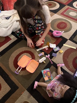 - Includes: luggage, 2 luggage labels and tag, neck pillow, toothbrush with case, toothpaste, water bottle, sunglasses, camera, boarding pass and holder, 2 photos, passport, unicorn eye mask, pretend tablet, play food items, and a toiletry case.
