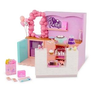 Turn every day into the ultimate surprise celebration with the Our Generation Party Shop playset for 18-inch dolls! Designed in cheerful colors with a striking pink balloon arch, this unique playset has everything kids need to run their own party shop as they prep for birthdays and more fun-filled events. At the heart of this playset is a charming display area with a mini fridge, shelf, and foldout counter to showcase over 15 dessert items. It includes cupcakes, pie, fruit tarts, and a scented cake that really smells like yummy chocolate! Individual slices also mean kids can share each detailed treat with party guests, while the birthday cupcake makes every doll's big day extra special. Plus, pretend decorating and serving is even more engaging with a piping bag, sprinkle shaker, bottle of strawberry syrup, and carryout boxes to bring the fun on the go. Ready to complete your order? A themed gift bag and partyware items like spoons, forks, cups, and plates are neatly packaged to put the finishing touches on every party scene. And it comes with a payment terminal and credit card that add a realistic twist to storytelling. The Our Generation Party Shop playset makes a wonderful gift for kids ages 3+ (small parts), encouraging them to imagine their own unique stories. Compatible with most 18-inch dolls and accessories. Our Generation dolls sold separately.