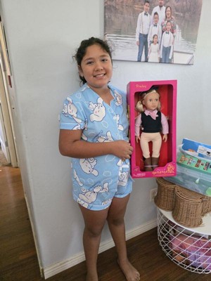 Ride into fun with Our Generation 18-inch doll Presley! A horse lover at heart, this Western-inspired doll is ready to hit the trails for a dream adventure. She wears a cute riding outfit paired with a stylish hair bow and scarf decorated in a golden horseshoe pattern. Her country look is complete with tall riding boots to take the storytelling on horseback! Presley's huggable soft body and lifelike features will delight doll fans during playtime. Her beautiful gray eyes open and close, and her brushable light-blonde hair is fun to style into their favorite cowgirl trends. Plus, her easy-change outfit inspires endless mixing and matching for kids to explore imagination and self-expression. Our Generation dolls make a great gift for kids ages 3 years old and up (small parts), encouraging them to create their own unique stories.